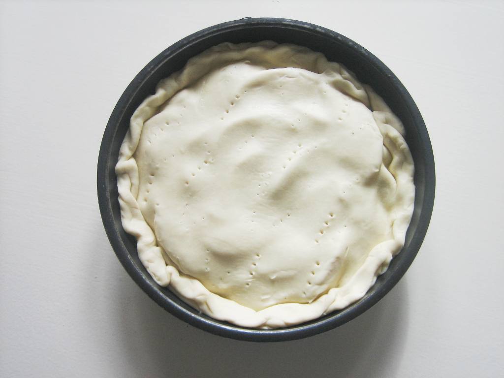 Tapamos con el disco de hojaldre , pinchamos con un tenedor e introducimos en el horno precalentado a 180º